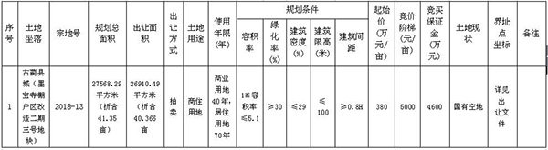 自《公告》發(fā)布之日起,有意競買者可于2018年7月10日17:00時前到古藺縣公共資源交易中心咨詢、索取出讓文件。競買申請人須于2018年7月11日下午17:00時前(節(jié)假日除外)申請人憑競買保證金繳納憑證(競買保證金須存入古藺縣公共資源交易中心指定賬戶,并經(jīng)核準(zhǔn)到賬)及出讓文件規(guī)定須提交的相關(guān)資料到古藺縣公共資源交易中心辦理申請競買手續(xù)。經(jīng)審查,申請人按規(guī)定交納競買保證金且具備申請條件的,憑競買資格確認(rèn)通知書參加拍賣會。(詳見出讓文件)